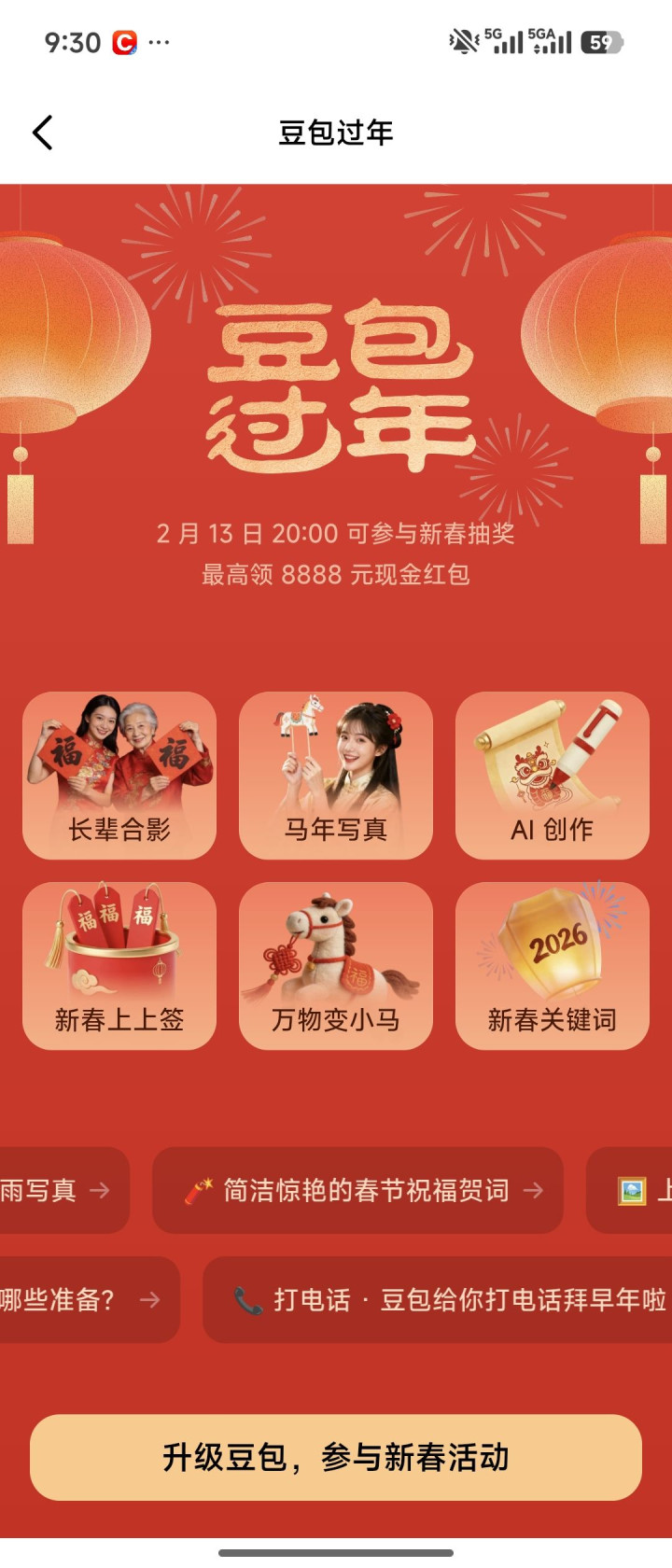 点击该选项,澳门十大娱乐网站出现的页面显示,a8体育app“2月13日20:00可参与新春抽奖,最高领8888元现金红包”,底部写有“升级豆包,参与新春活动”字样。