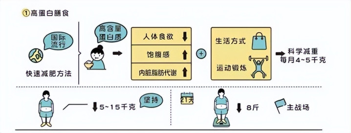 高含量优质卵白摄入后会扼制东说念主的食欲,饱腹感增强,还概况动员内脏脂肪代谢,奏效相比快,如果合作精采的生存款式,再加上灵验的通顺窥探,一个月能减4-5千克,短期内可快速减重。