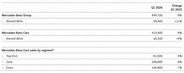 4月9日,梅赛德斯-奔突集团在官网发布2026年第一季度销量讲述。数据泄露,该集团第一季度民众销量为49.97万辆,同比下滑6%。其中,梅赛德斯-奔突乘用车业务民众销量为41.94万辆,同比下落6%,合适该公司预期。