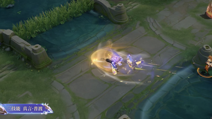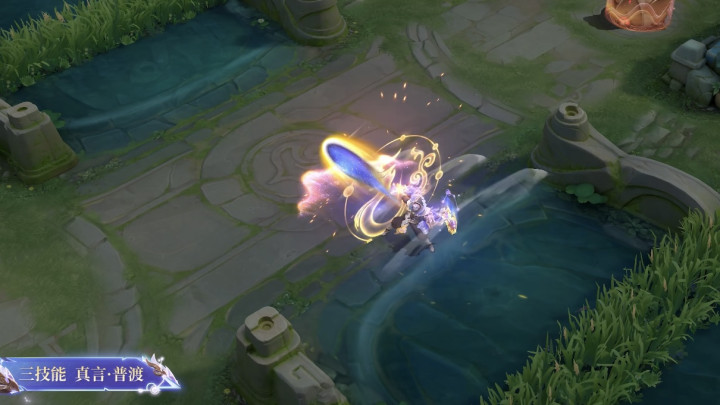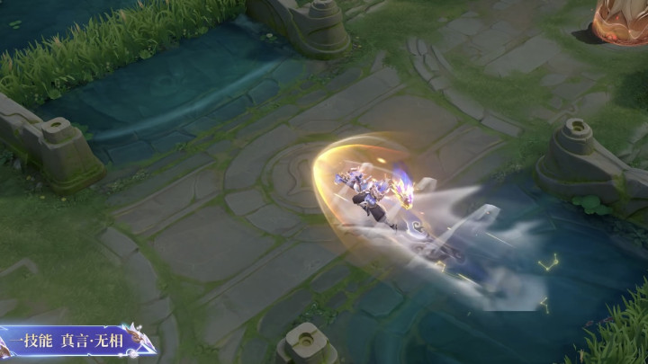 达摩这款皮肤使用一手段后,会带着星辰护盾往前冲,在眼下留住亢金龙的图案。