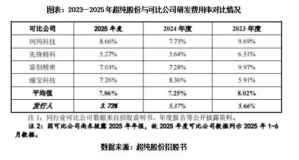 从研发干与来看,超纯股份呈现出“用度领域偏小、费率抓续下行、显赫低于同行”的赫然特征。2023—2025年,该公司研发用度别离为956.06万元、1378.84万元、1849.30万元,研发用度率别离为5.66%、5.37%、3.73%,研发用度率呈逐年下滑态势。