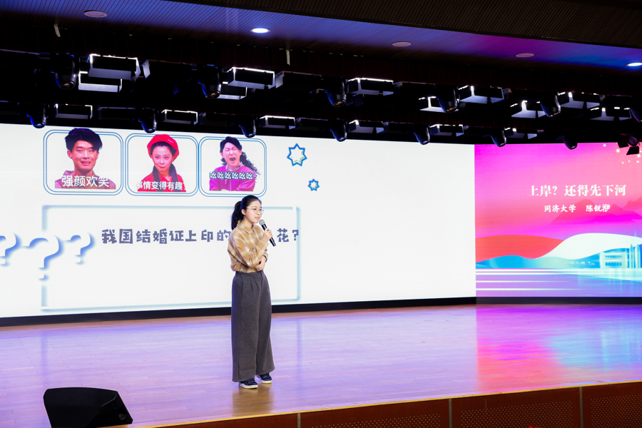 “最近我下定决心要考公了。为了提前预习我‘光明的畴昔’,我加了几位依然上岸的学长师姐,千里浸式备考,戒指……”这位胜利在台上讲起脱口秀的后生,是来自同济大学法学院的“05后”学生陈锐洢。