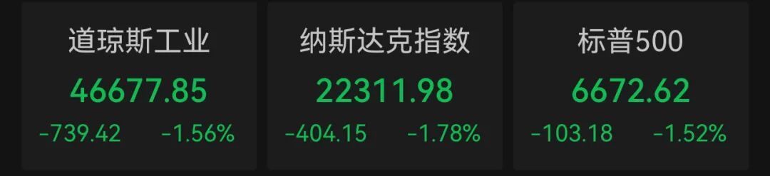 散伙收盘,说念琼斯工业平均指数收盘下降739.42点,跌幅1.56%,报46677.85点;标普500指数下降103.18点,跌幅1.52%,报6672.62点;纳斯达克概括指数下降404.15点,跌幅1.78%,报22311.98点。